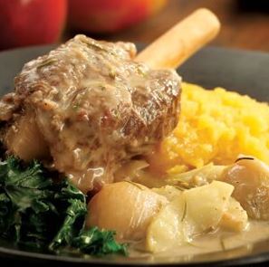 Serve these succulent braised lamb shanks dressed in a savory apple-shallot sauce for a special fall supper. The shank, a tougher cut of meat from the top of the leg, becomes fall-off-the-bone tender after simmering in hard cider. Don’t skimp on the shallots: peeling 12 of them takes some time, but they are the base for the rich sauce. Serve over mashed rutabaga or potatoes.